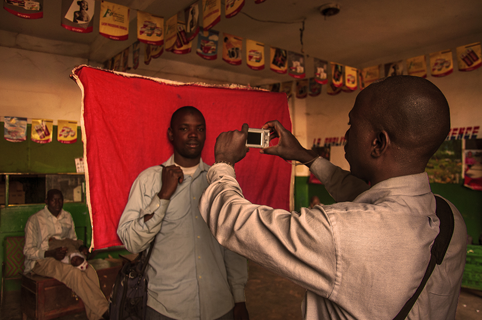 Toma de fotos de identidad en un laboratorio. El fondo es sostenido por otro fotógrafo. Labé, Guinea Conakry.
