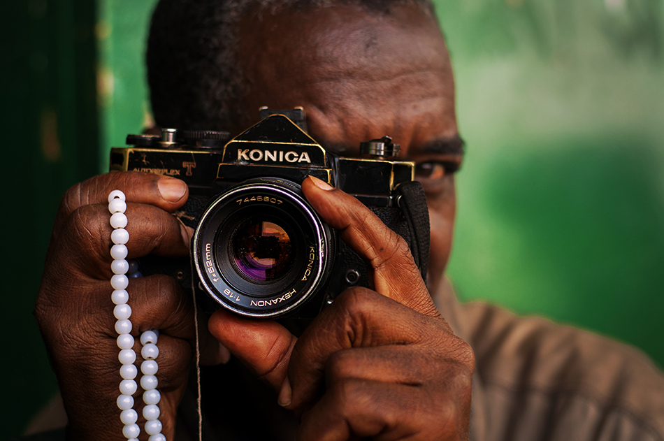 Retrato de un fotógrafo guineano y su vieja Konika.