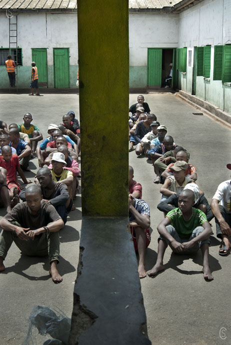 Les jeunes sont réunis dans la cour lors d’une visite de religieux. Prêches et chants accompagnent cette visite. Au fond, à droite, porte communiquant avec le poste des gardiens.