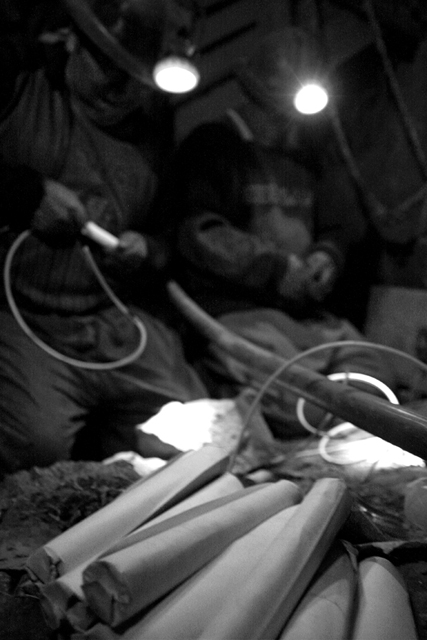 - Armando dinamita. Mientras se inicia la perforación, dos miembros de la cuadrilla preparan el explosivo en tubos de papel. El canto popular de Horacio Guarany reza: "No te cases con minero, su novia es la dinamita, que ella de un beso violento cualquier día te lo quita".