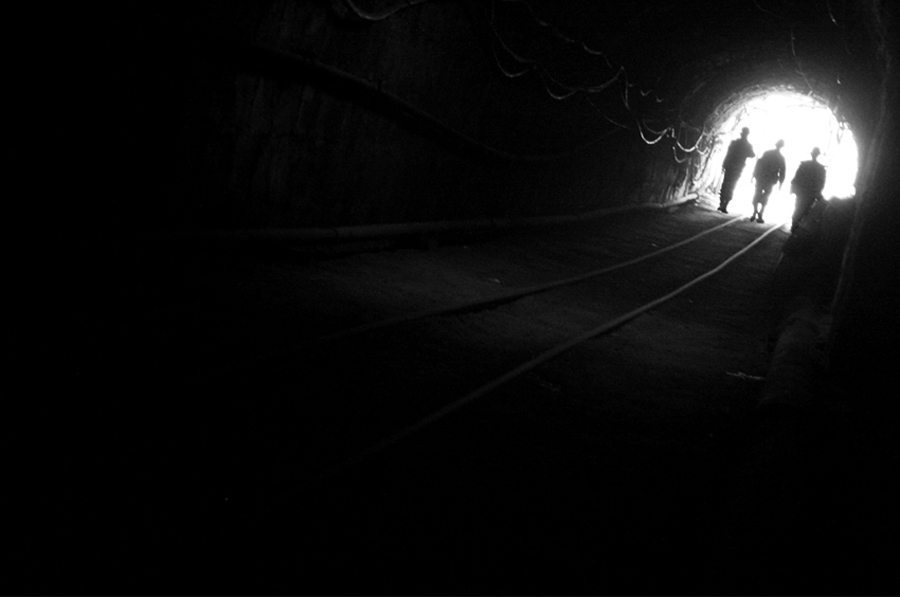 - Passage from light to darkness, from the gods of the sun to the spirits of belowground: miners enter their workplace. The lamps on their helmets are lighted.
